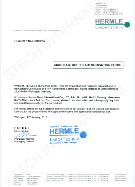 Rất vinh dự cho CÔNG TY TNHH XNK VẬT TƯ KHOA HỌC QUỐC TẾ - STECH chính thức trở thành nhà cung cấp thiết bị chính hãng HERMLE tại Việt Nam.